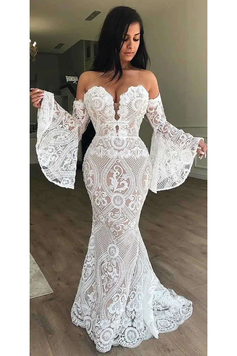Off White Mermaid Lace Long Sleeves Prom Dresses, Elegant Formal Evening Dresses DMP338