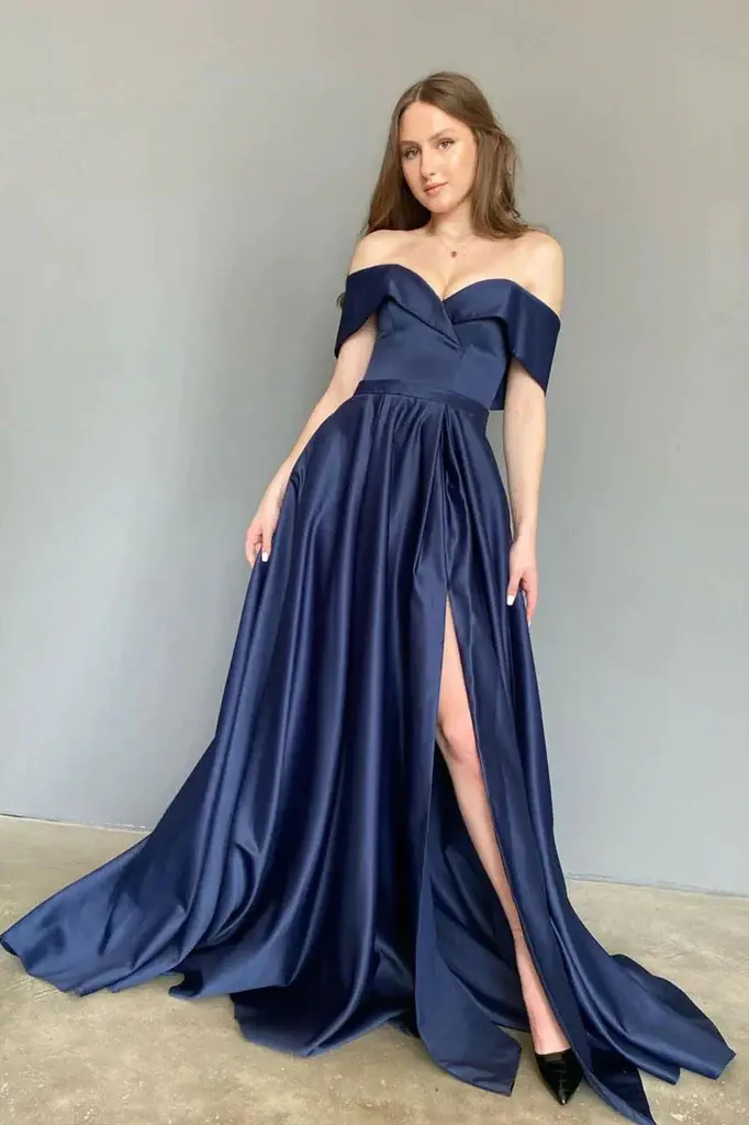 Dark Blue A Line Satin Off the Shoulder Long Prom Dresses, Formal Evening Dresses DMP343