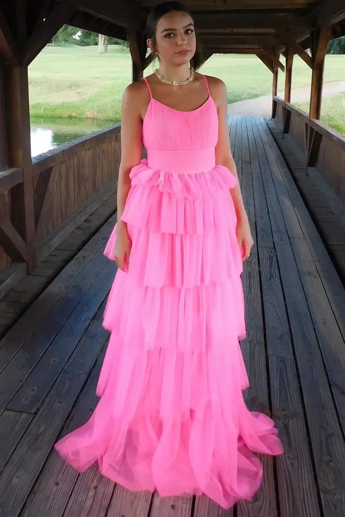 Hot Pink A Line Tulle Spaghetti Straps Long Prom Dresses, Formal Evening Dresses DMP342