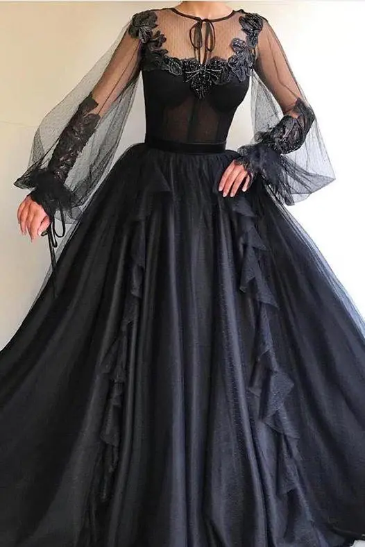 Black Long A-line Tulle Prom Dress, Long Sleeves Modest Evening Gown DMG82