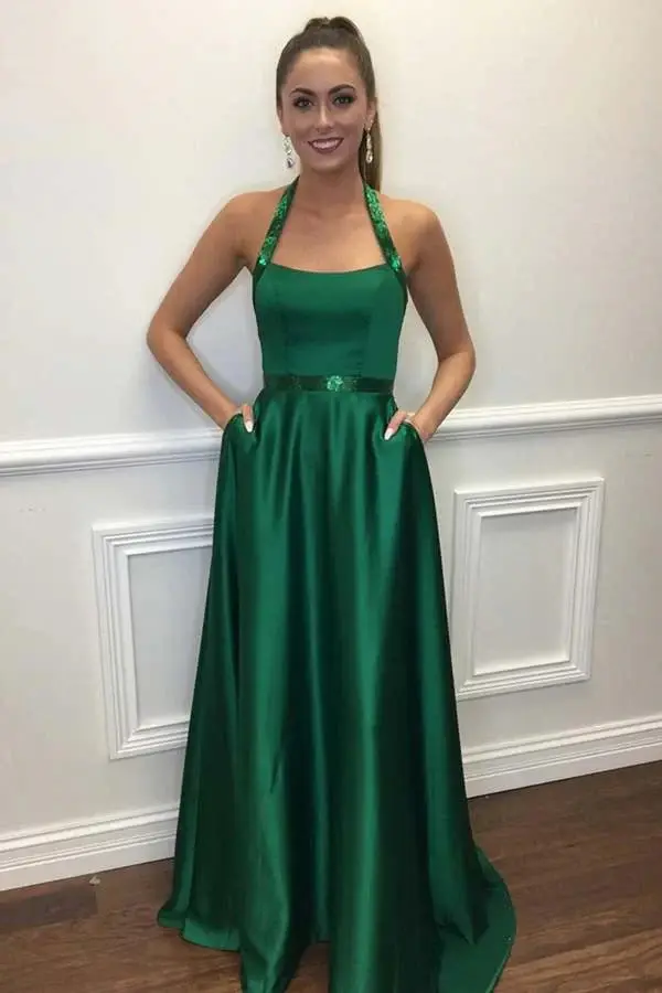 A Line Halter Green Long Prom Dresses With Pocket Satin Formal Evening Dresses DMP291