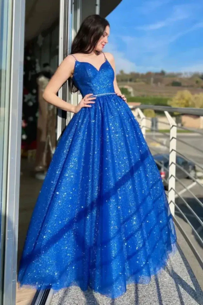 Shiny A Line Royal Blue Tulle Long Prom Dresses, Formal Evening Dresses DMP294