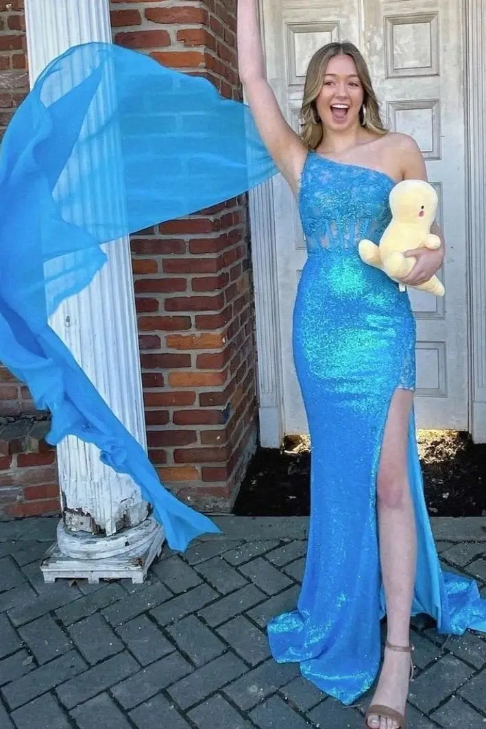 Chic Mermaid Blue One Shoulder Sequins Lace Long Prom Dresses DMP301