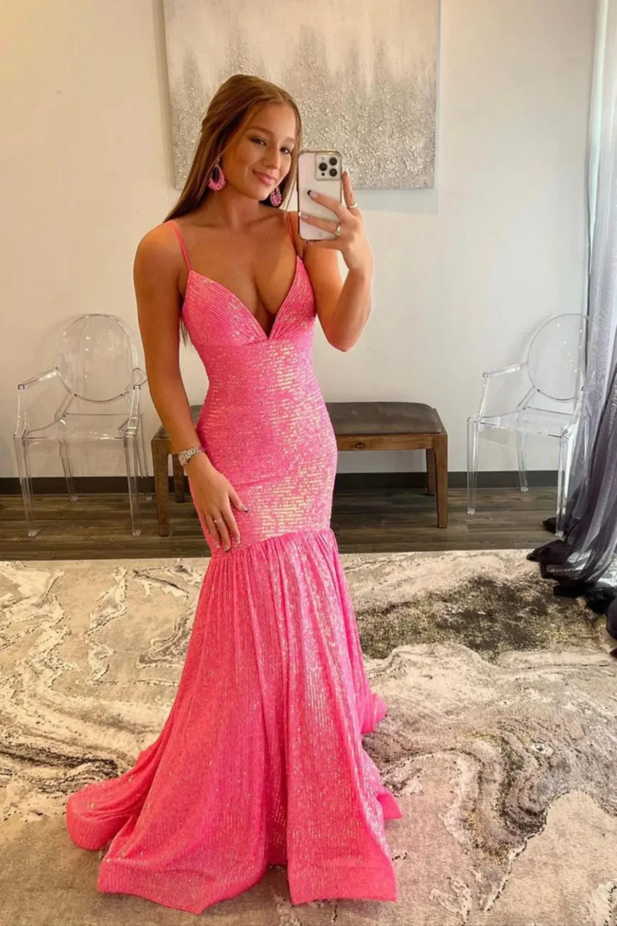 Shiny Sequins V Neck Mermaid Long Prom Dresses, Formal Graduation Evening Dresses DM1911