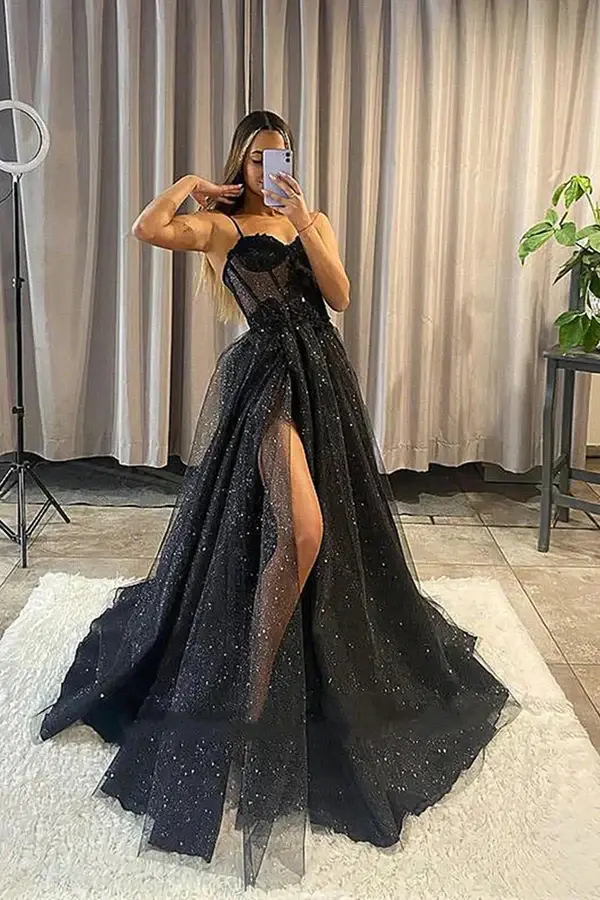 A Line Black Long Lace Appliques Prom Dresses, Formal Evening Dresses DM1914