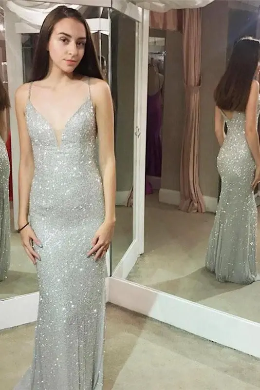 Shiny Mermaid Spaghetti Sheath Silver Long Sexy Prom Dresses DMG35