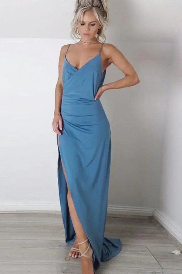 Sheath Spaghetti Straps Sweep Train Blue Simple Prom Dress with Split DMK62