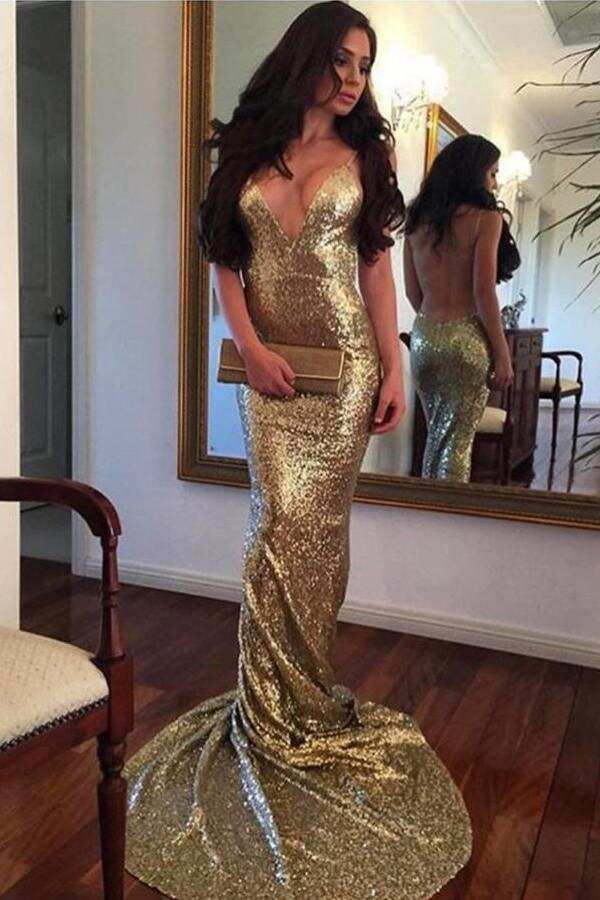 Sexy Deep V-neck Mermaid Backless Sparkly Prom Dresses For Teens K761