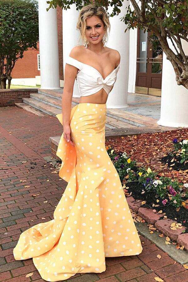 Charming 2 Pieces Off The Shoulder Yellow Long Mermaid Prom Dresses DMH2