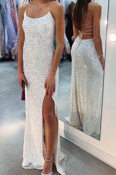 Sparkly Sheath Spaghetti Straps Sequined White Formal Prom Dress DMP023