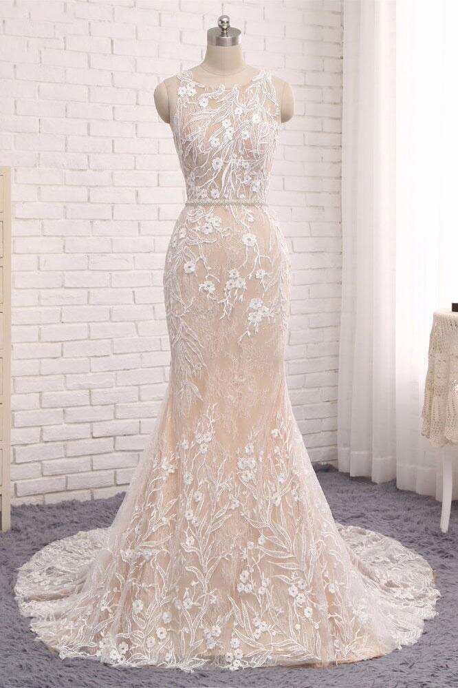 Unique Mermaid White Sleeveless Prom Dress,Lace Long Sweep Train Wedding Dress DM636