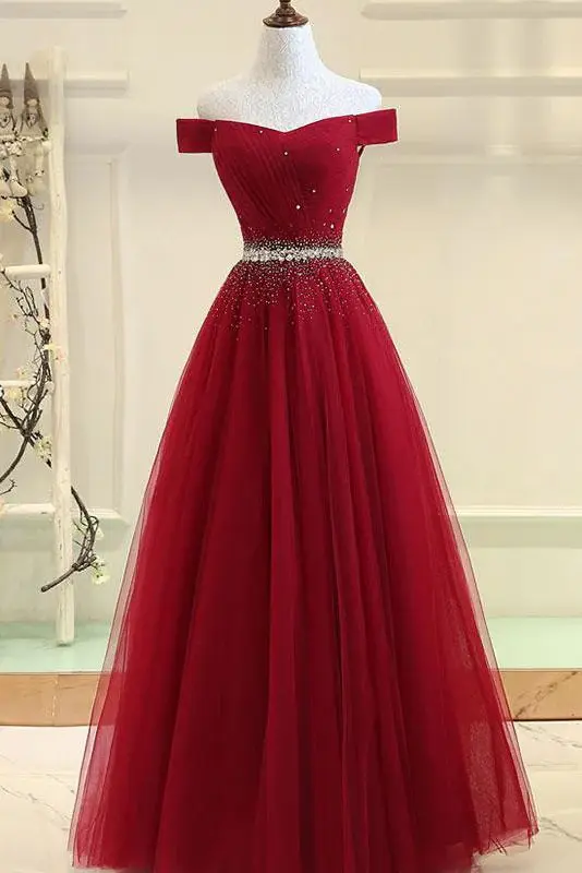 Burgundy A Line Off the Shoulder Beads Long Prom Dress DMI52