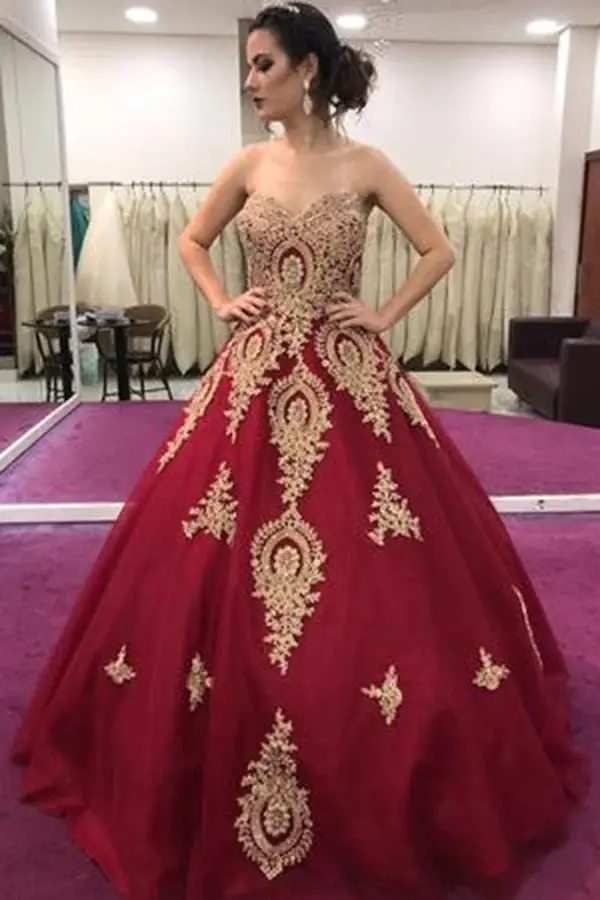 Gold Lace Appliques Sweetheart Ball Gown Prom Dress Sweet 16 Dress Quinceanera Dresses DMI59