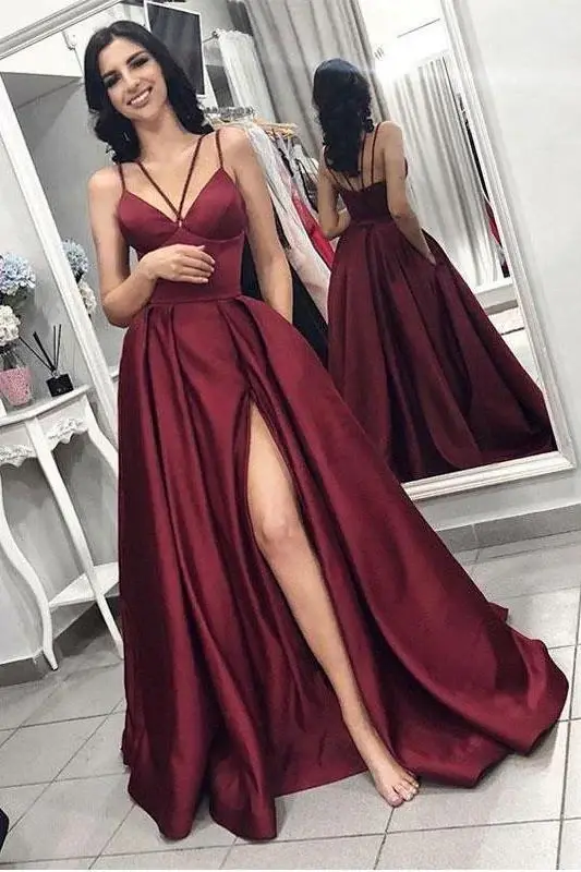 Maroon Spaghetti Straps Side Slit Long A Line Elegant Evening Prom Dresses DMI58