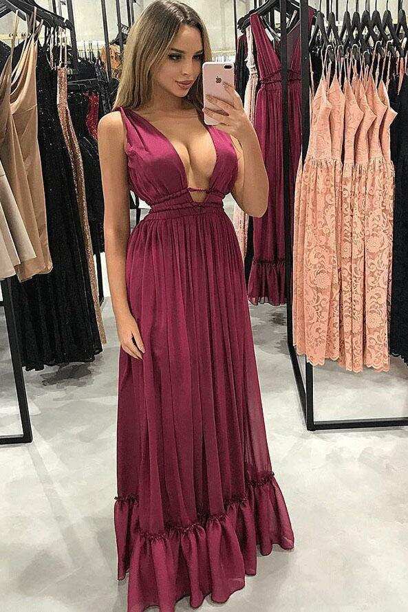 Sexy A-Line V-Neck Pleated Burgundy Chiffon Prom Party Dress DMF8