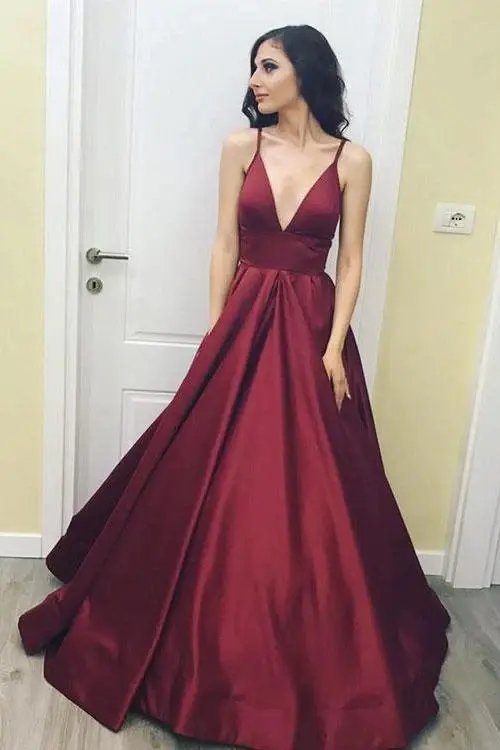 Simple Spaghetti Straps Burgundy V neck Long Prom Dress,A Line Formal Evening Dress DM401