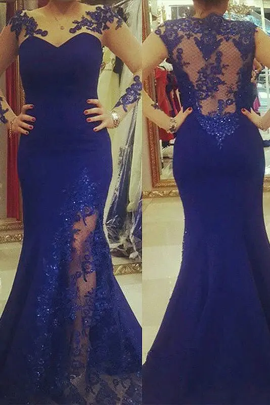 New Arrival Scoop Applique Long Sleeves Royal Blue Mermaid Plus Size Dresses DMF47