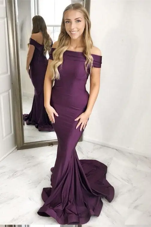 New Arrival Mermaid Off-the-Shoulder Sweep Train Grape Prom Dress with Ruched DMF56