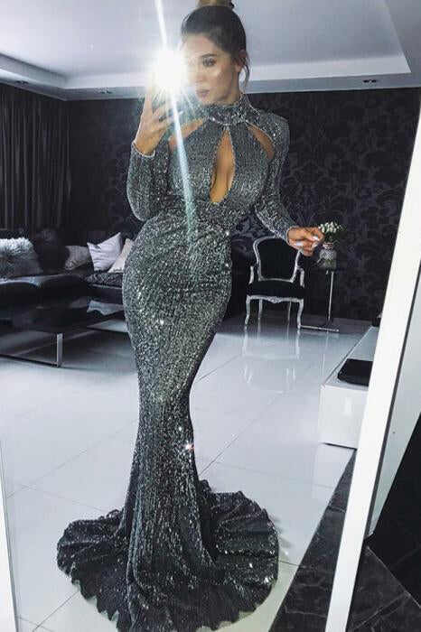 Sexy Long Sleeves Sequin Mermaid Shinning Sweep Train Cheap Prom Dresses DME51