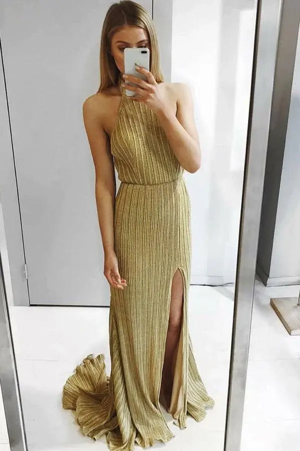 Sexy Sheath Halter Backless Sweep Train Gold Prom Party Dress with Split DMG3