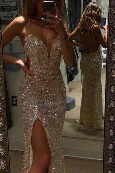 Spaghetti Straps Sequins Mermaid Prom Dresses, Sparkly Slit Long Formal Gown DMP173
