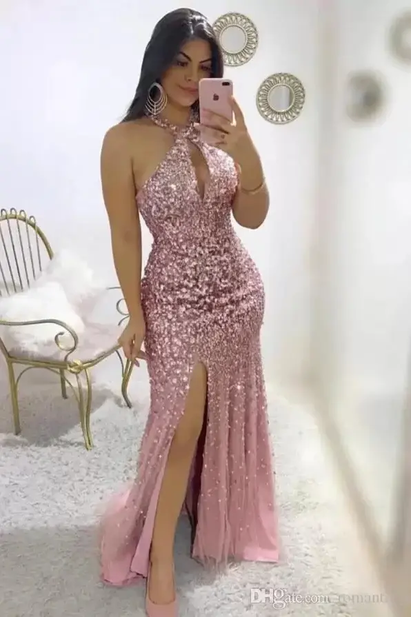 Elegant Pink Slleveless Sequin Prom Dresses Mermaid Formal Evening Gowns DMP184