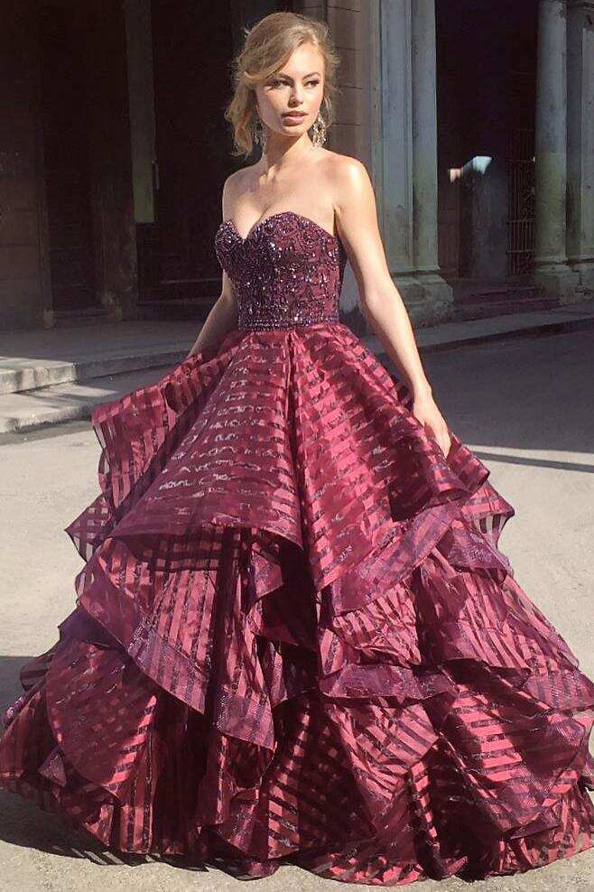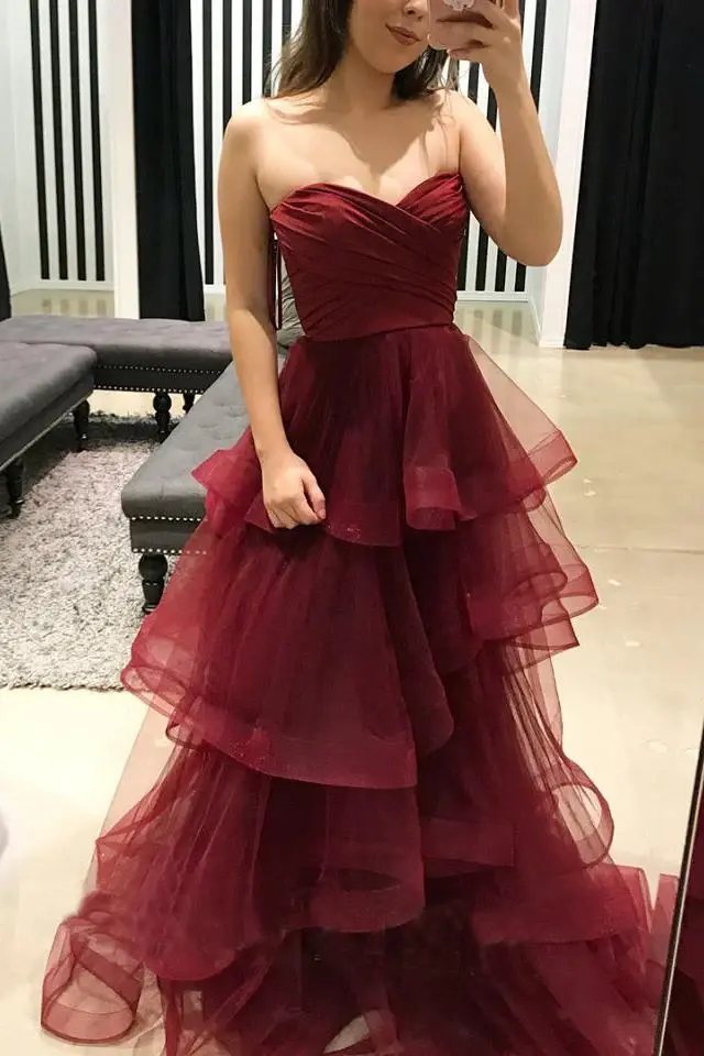 Burgundy Sweetheart Puffy Pleated Ruffles Long Prom Dresses DM938