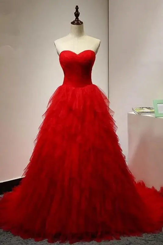 Chic Sweetheart A Line Zipper Back Red Ruffles Cheap Long Prom Dress DMG22