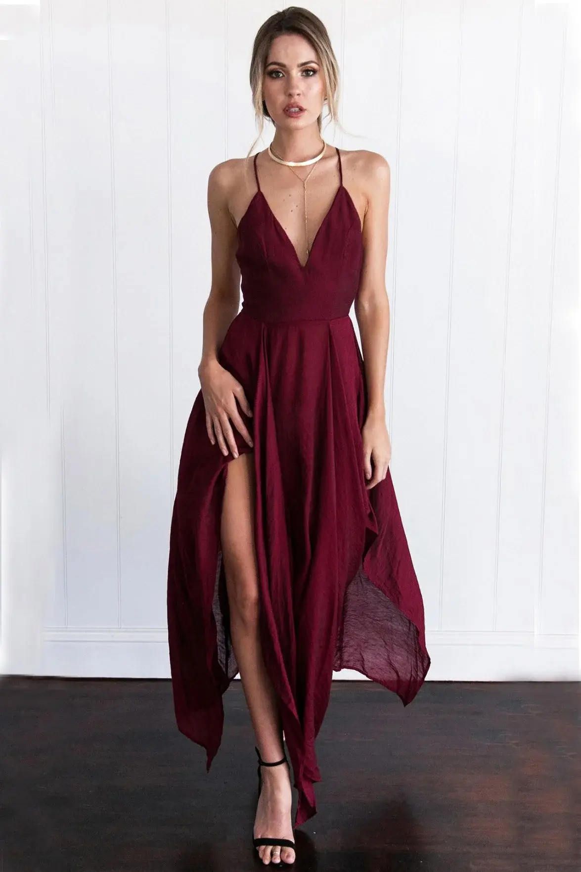 Chiffon Spaghetti Straps V Neck Cross Back Burgundy Assymetrical Hem Long Prom Evening Dress DM629