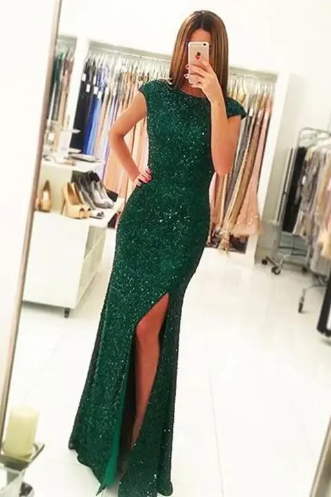 Luxurious Cap Sleeves Dark Green Split-Front Open Back Long Sequin Sexy Mermaid Prom Dress DM150