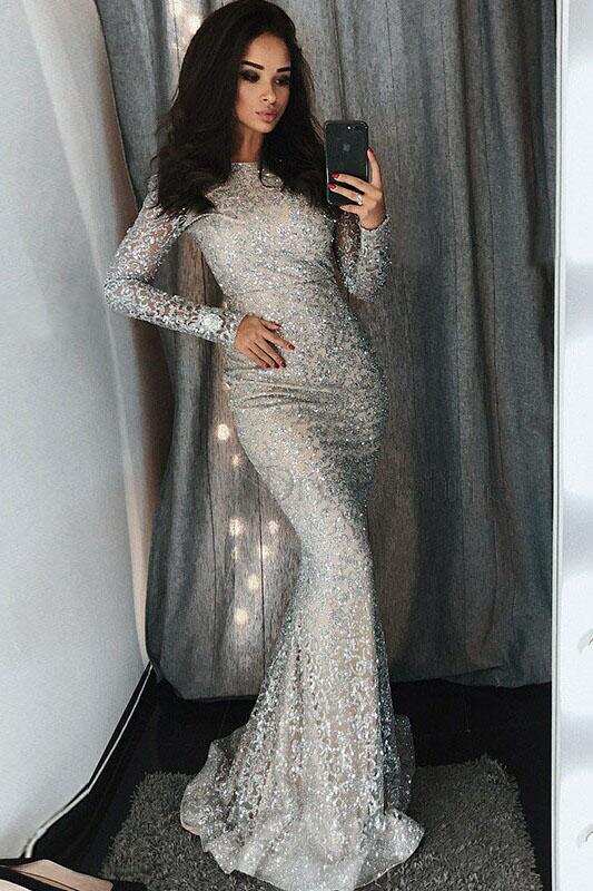 Mermaid Bateau Sliver Lace Long Sleeves Evening Prom Dress with Sequins DMF33