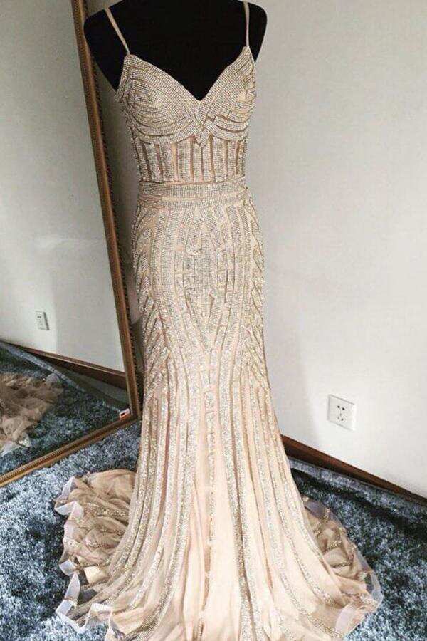 Luxurious Trumpet Spaghetti Sleeveless Long Beading Prom Dress DMA23