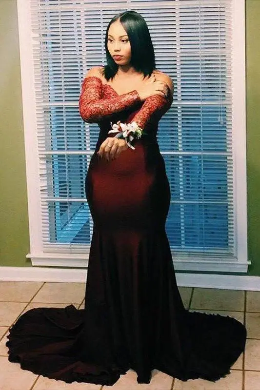 Mermaid Off-the-Shoulder Long Sleeves Lace Applique Plus Size Prom Dresses DMF41
