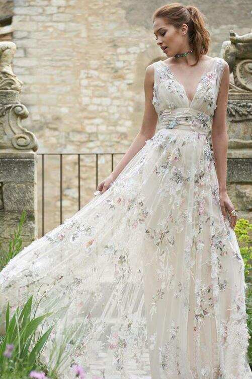 Rustic Deep V Neck Colorful Lace Tulle A Line Floor Length Wedding Gowns DMP90
