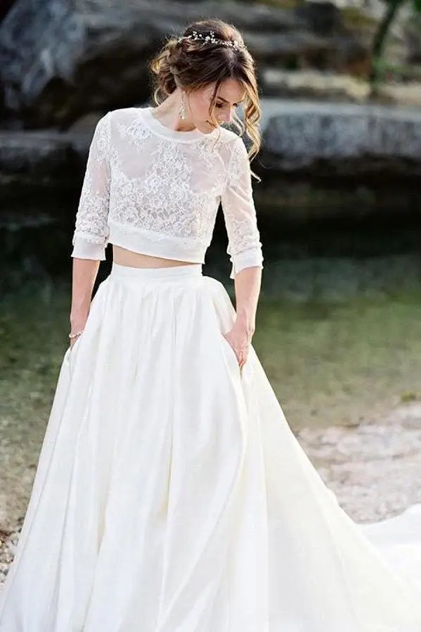 Ivory Lace Top Two Pieces Wedding Dresses Gorgegous Sweep Train Wedding Gowns With Pockets DMP84
