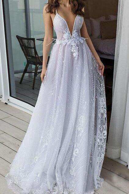 White Deep V Neck Beach Wedding Dresses Spahetti Straps Lace Bridal Dresses DMP89