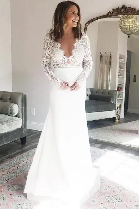 Sheath V-Neck Long Sleeves Deep V Neck Wedding Dress with Lace Top DMR76