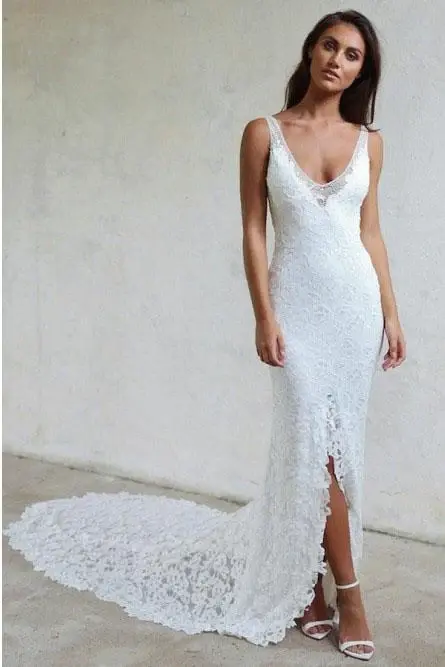 Sheath V-Neck Backless Wraps Lace Beach Wedding Dress with Split DMR34