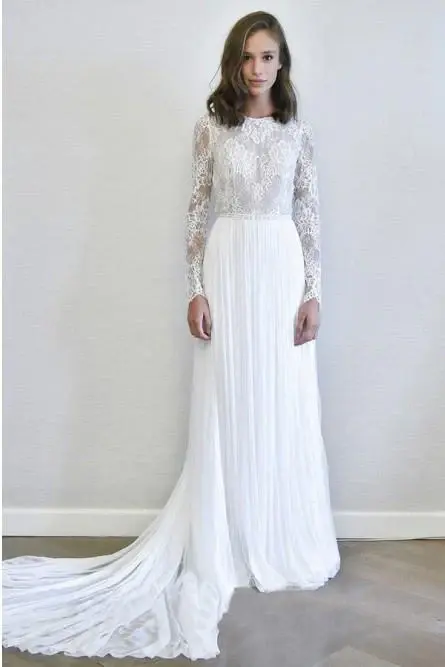 A-Line Long Sleeves Chiffon Long Simple Wedding Dress with Lace DMR78