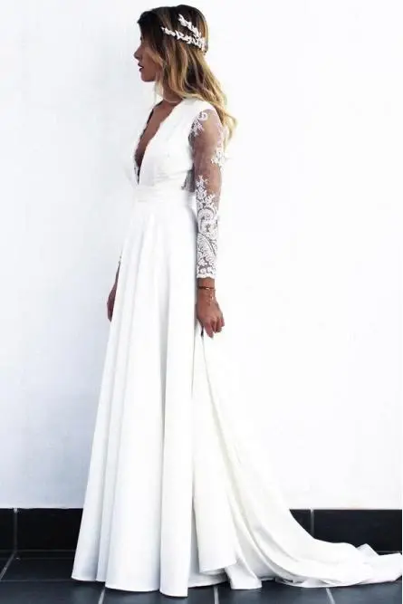 A-Line V-Neck Open Back Long Sleeves Wedding Dress with Lace Appliques DMR82