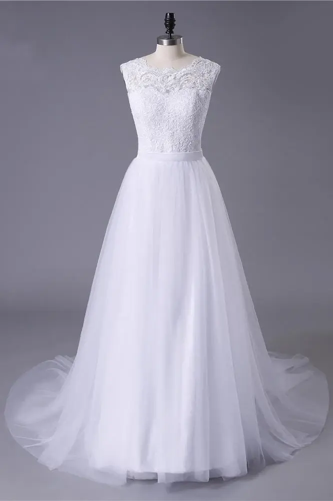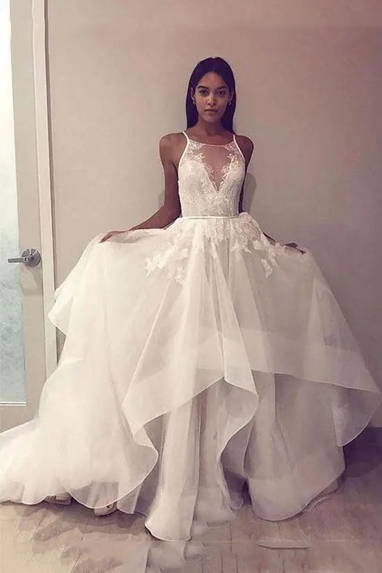 A Line Tulle Appliques Long Prom Dress Open Back Cheap Wedding Dress DMH86