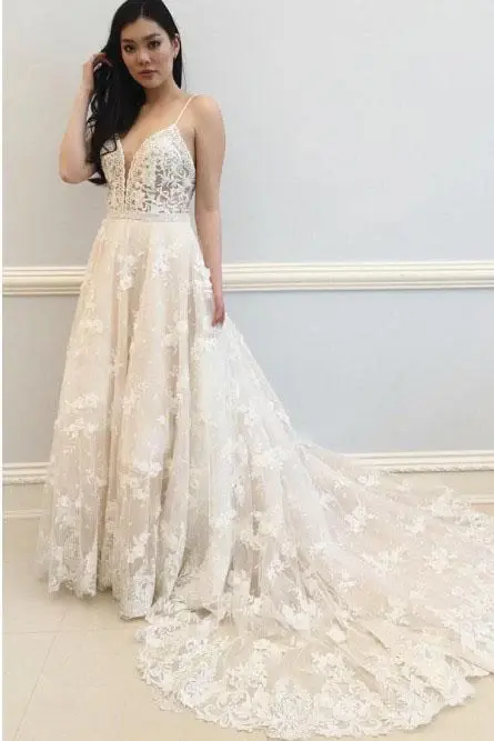 A-Line Spaghetti Straps Off White Wedding Dress with Appliques DMK39