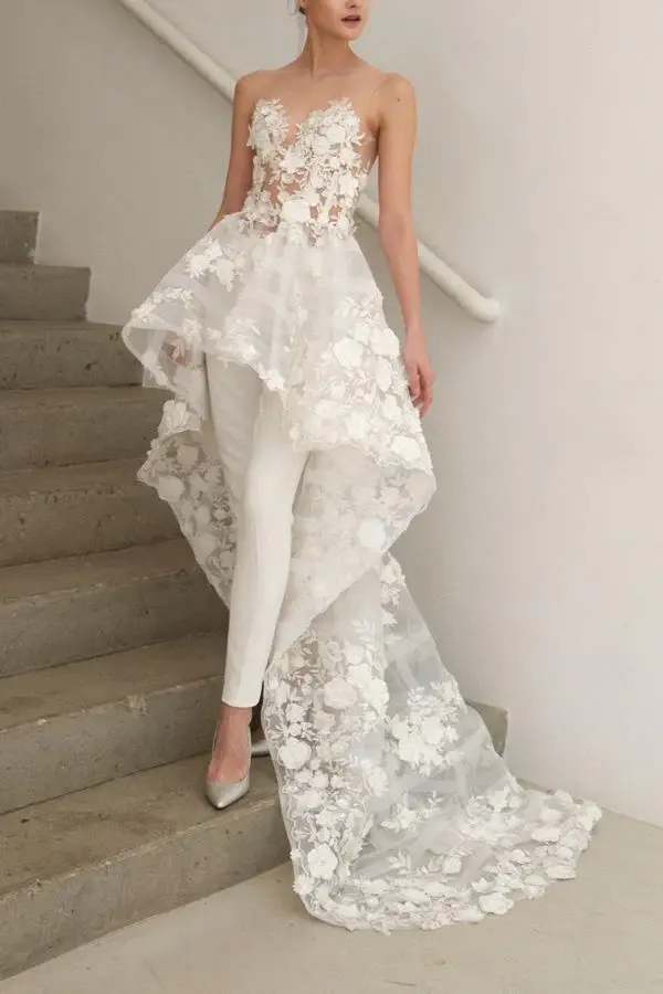 Illusion Round Neck High-Low Wedding Jumpsuit with Appliques DML62