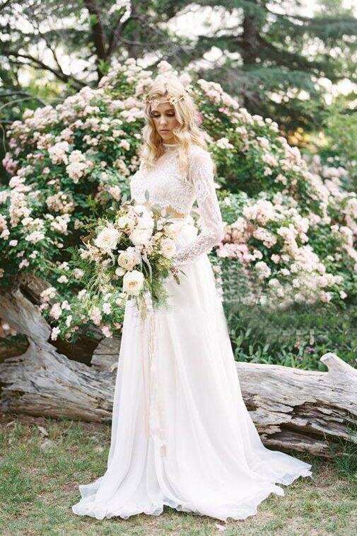 2 Pieces Lace Top Chiffon Skirt Romantic Long Sleeves Wedding Dresses DMM82