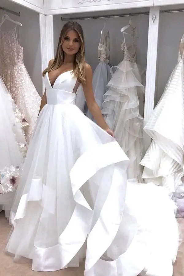A-Line Spaghetti Straps Sweep Train Tulle White Wedding Dress Bridal Gown DMM30