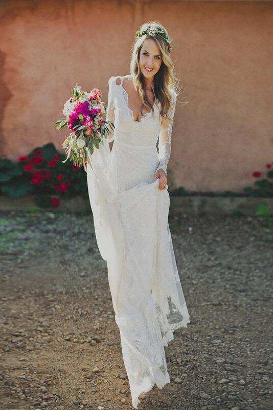 Sheath V-neck Backless Long Sleeves Lace Boho Wedding Dresses DMM83