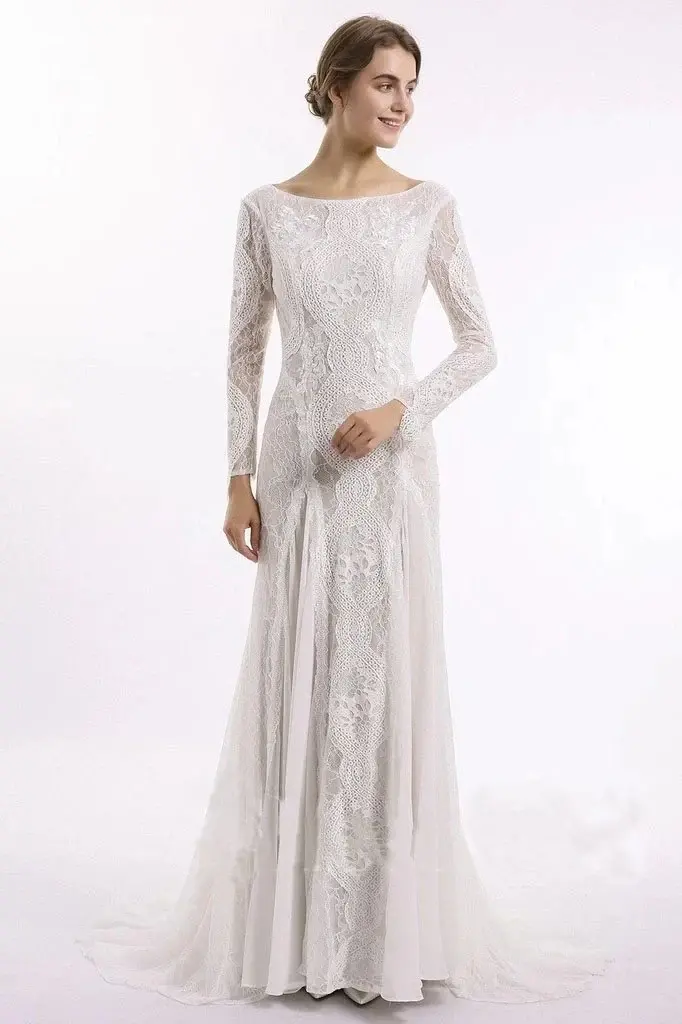 Elegant Lace Bridal Dress, Long Sleeves Backless Beach Wedding Dresses DMN91