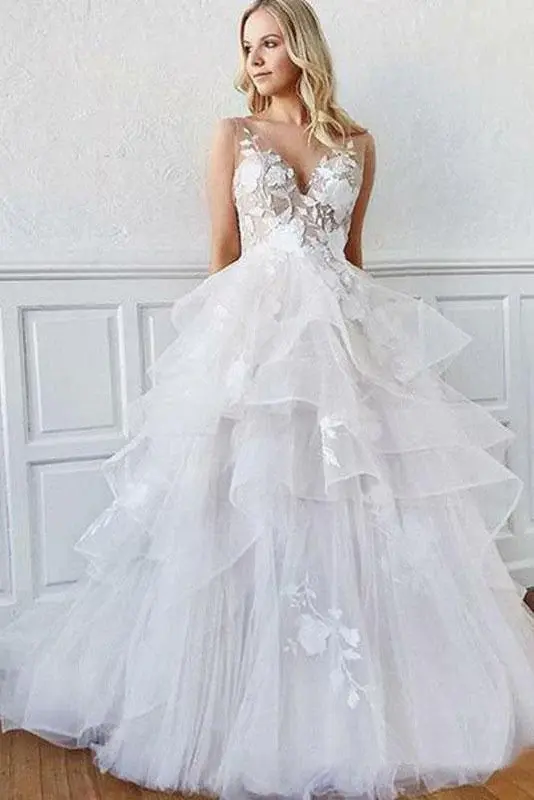Romantic A-Line V Neck Tiered Appliques Tulle Long Wedding Dresses DMM87
