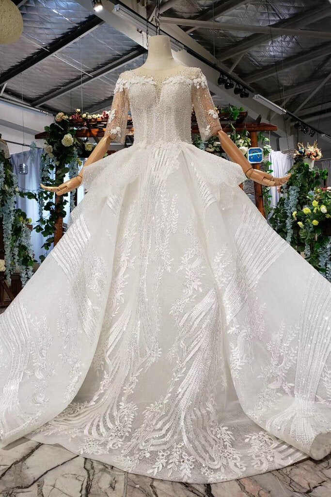 Ball Gown Half Sleeves Lace Bridal Dress with Sequins, Princess Long Wedding Dress DMN72