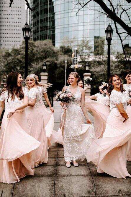A Line Two Piece Short Sleeves Floor-Length Pink Bridesmaid Dress with Lace DMR89